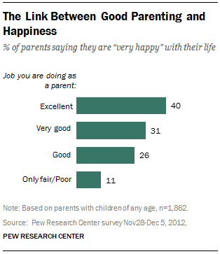 Průzkum Pew Research z listopadu 2012 zjistil, že mezi vdanými/ženatými dospělými uvedlo 36 % rodičů a 39 % bezdětných, že jsou se svým životem „velmi šťastní“. Naproti tomu mezi svobodnými dospělými s dětmi uvedlo totéž pouze 23 % a mezi bezdětnými svobodnými 22 %. Svobodní rodiče byli nejpravděpodobnější skupinou, která uvedla, že jsou se svým životem „málo šťastní“ (25 %).